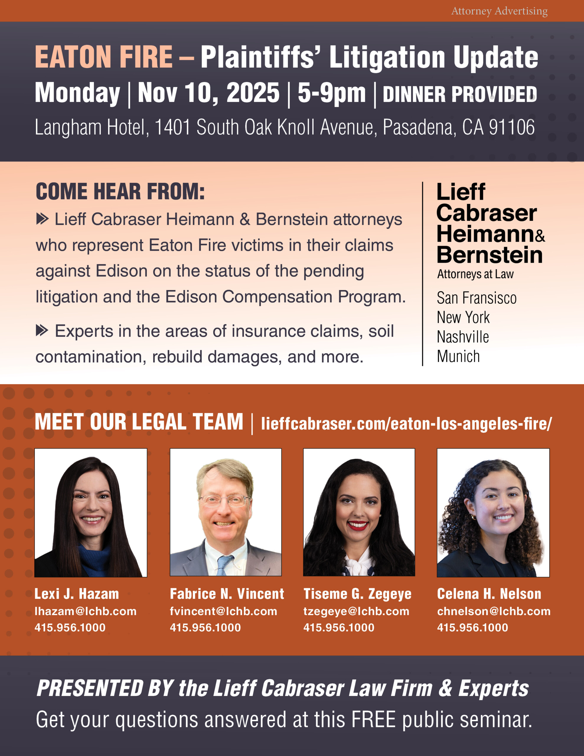 The Lieff Cabraser law firm has successfully litigated wildfire and other environmental cases on behalf of devastated California homeowners and businesses for over 30 years. We represent clients in their potential claims against Southern California Edison, the electrical utility for Los Angeles, for its role in the Eaton Fire.